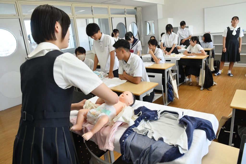 《文化教養科》の生活福祉コースは赤ちゃん人形着替え体験や目隠しや手に重りをつけてのゲーム。キャリアデザインコースはハウステンボス研修報告やテーブルマナークイズ。