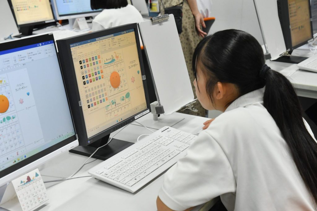 《情報ビジネス科》は本校生徒がアドバイスしながら簿記、電卓、文書デザインの学習を行い、