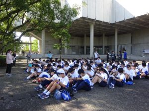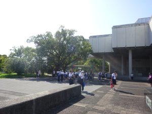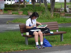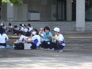美術科の増本先生からアドバイスとして、1年生は「構図をとる」こと、2・3年生は「構図をとったうえでプラスアルファの創意工夫をする」ことを聞き、それぞれが決めた場所でスケッチを始めました。電光石火の早さで場所を決めて描き始める生徒もいれば、納得のいく場所を求めて歩き回る生徒など、描く景色を決めるだけでも個性が表れていました。また、同じ景色であっても物の輪郭や遠近、草木の緑や空の青などの色の濃淡は様々で、先生方のアドバイスを参考にしながら見た景色を表現していました。2学期ともなると学年の垣根を越えて仲を深めており、談笑しながら約5時間のスケッチを終えました。帰る前には「使う前より美しく」をスローガンに、美化部が中心となってゴミ拾いや絵の具汚れのチェックをしました。