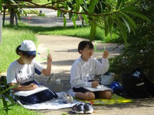 中学生全員で校外活動を行うのは4月の北山合宿以来ということもあり、生徒たちは学校を出発する前からわくわくした表情を見せていました。暑さを感じさせないように風が吹き、心地よい晴天のもとでスケッチ会を楽しむことができました。